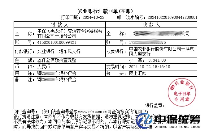 2024年10月11日10:40,統籌車輛鄂C9***7在十堰市茅箭區東風大道劉家灣路段行駛時,與同向行駛小車鄂C7***M發生刮擦,造成車輛受損。我公司第一時間安排查勘人員到達現場處理事故。受損車輛后續維修定損過程我公司安排定損人員全程跟蹤,經我公司工作人員專業有效溝通,統籌補償共計:3341元整。客戶對我公司的服務非常滿意,表達了對我們工作的肯定,對我們中保統籌公司的認可,對我公司的服務質量給予了充分的肯定。